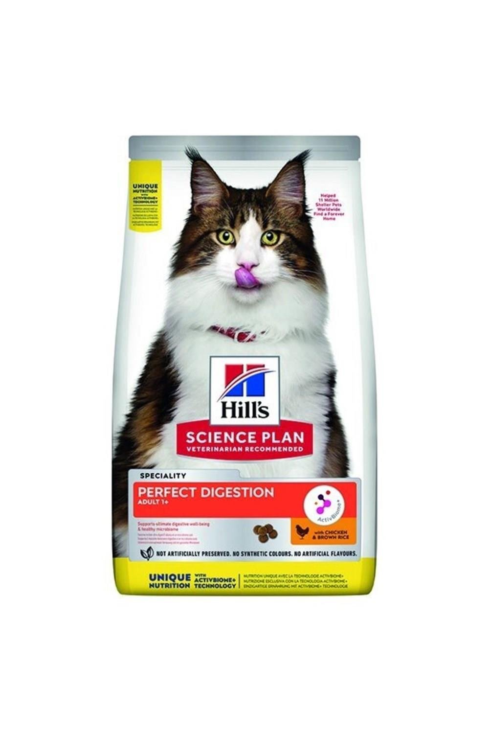 Hill's Science Plan PERFECT DIGESTION Yetişkin Tavuklu ve Kahverengi Pirinçli kedi maması Hill's tarafından geliştirilen ve evcil hayvanınızın benzersiz mikrobiyomunu hızla beslemeye ve dengelemeye yardımcı olan özel prebiyotik karışımı ActivBiome+ içerir.