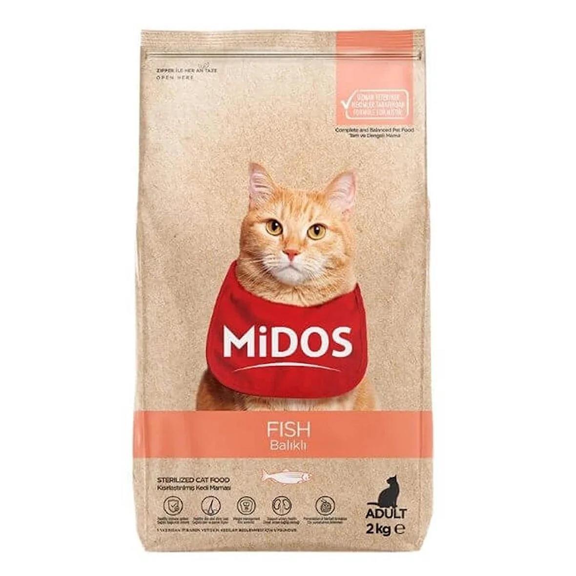 MİDOS Balıklı Kısırlaştırılmış Kedi Maması; kısırlaştırılmış kedilerin günlük beslenme ihtiyaçlarını karşılamak üzere formüle edilmiş somonlu hamsili tam ve dengeli kedi mamasıdır.
